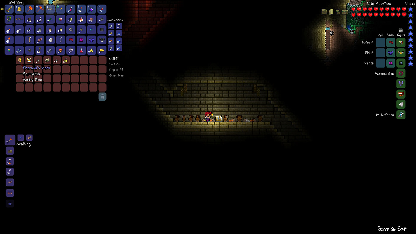 Создавайте оружие, чтобы сражаться с различными врагами в разных биомах. Копайте глубже, чтобы найти драгоценности, деньги и кучу других полезных вещей. Собирайте ресурсы, чтобы создать всё, что вам нужно, и сделать мир таким, каким вы хотите его видеть. Постройте свой дом, крепость или даже замок! Люди переедут к вам жить и вы сможете торговать с ними. Кроме этого вас ожидает еще множество разных задач и испытаний. Готовы начать?